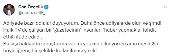 Odatv Haber Müdürü Can Özçelik, sosyal medya hesabından yaptığı paylaşımla dikkat çekti.Özçelik, adliyede dolaşan iddialara dikkat çekerek, daha önce adliyelerde görev yapmış ve şu anda Halk TV'de çalışan bir gazetecinin insanları haber yapmakla tehdit ettiğini belirtti.Özçelik, paylaşımında şu ifadeleri kullandı:"Adliyede bazı iddialar duyuyorum. Daha önce adliyelerde olan ve şimdi Halk TV’de çalışan bir ‘gazetecinin’ insanları ‘haber yapmakla’ tehdit ettiği ifade edildi. Bu kişi hakkında soruşturma var mı yok mu bilmiyorum ama mesleğin böyle iğrenç bir şekilde kullanılması yazık!"